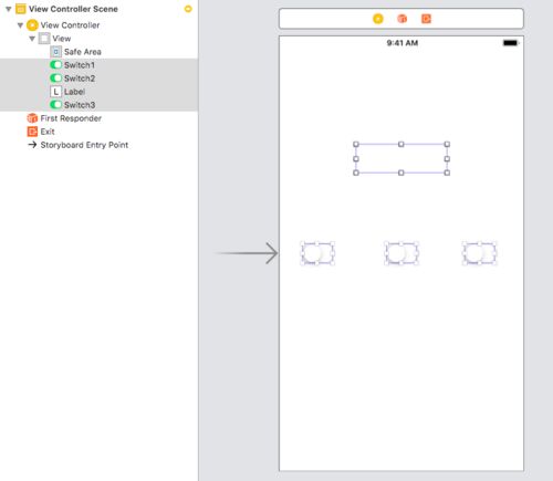 完成図 解説 ストーリーボード ソースコード 完成図 解説 ・UISwitchはON/OFFを司るUI部品 ・UISwitch.isOnは、true/false : ON/OFF ・1つのUISwitchで他のUISwitchのON/OFFを切り替えるには、他のUISwitchをOutletで接続する必要がある ・if文は三項演算子…